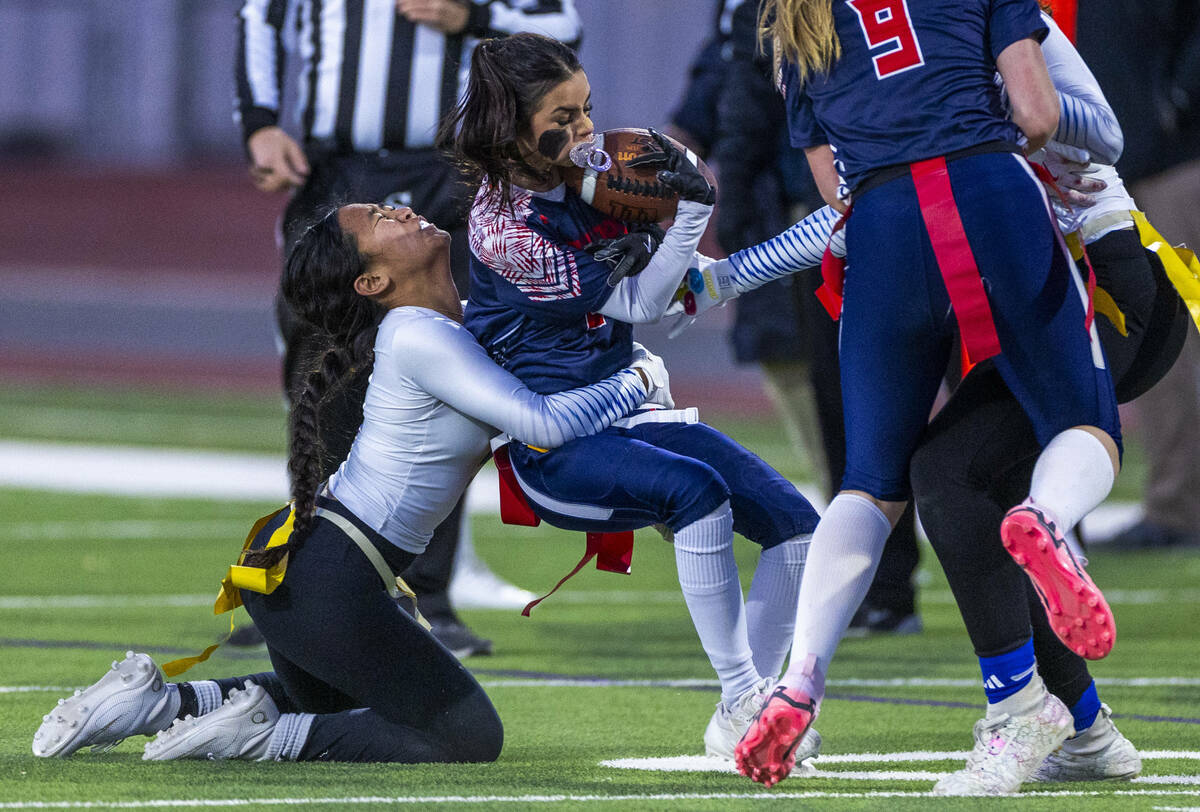 Coronado running back Maddy Aguilar (2) is wrapped up by Sierra Vista defender Amaya Acosta (5) during the second half of their Class 4A flag football state quarterfinals game at Coronado High School on Wednesday, Feb. 12, 2025 in Henderson (L.E. Baskow/Las Vegas Review-Journal) @Left_Eye_Images