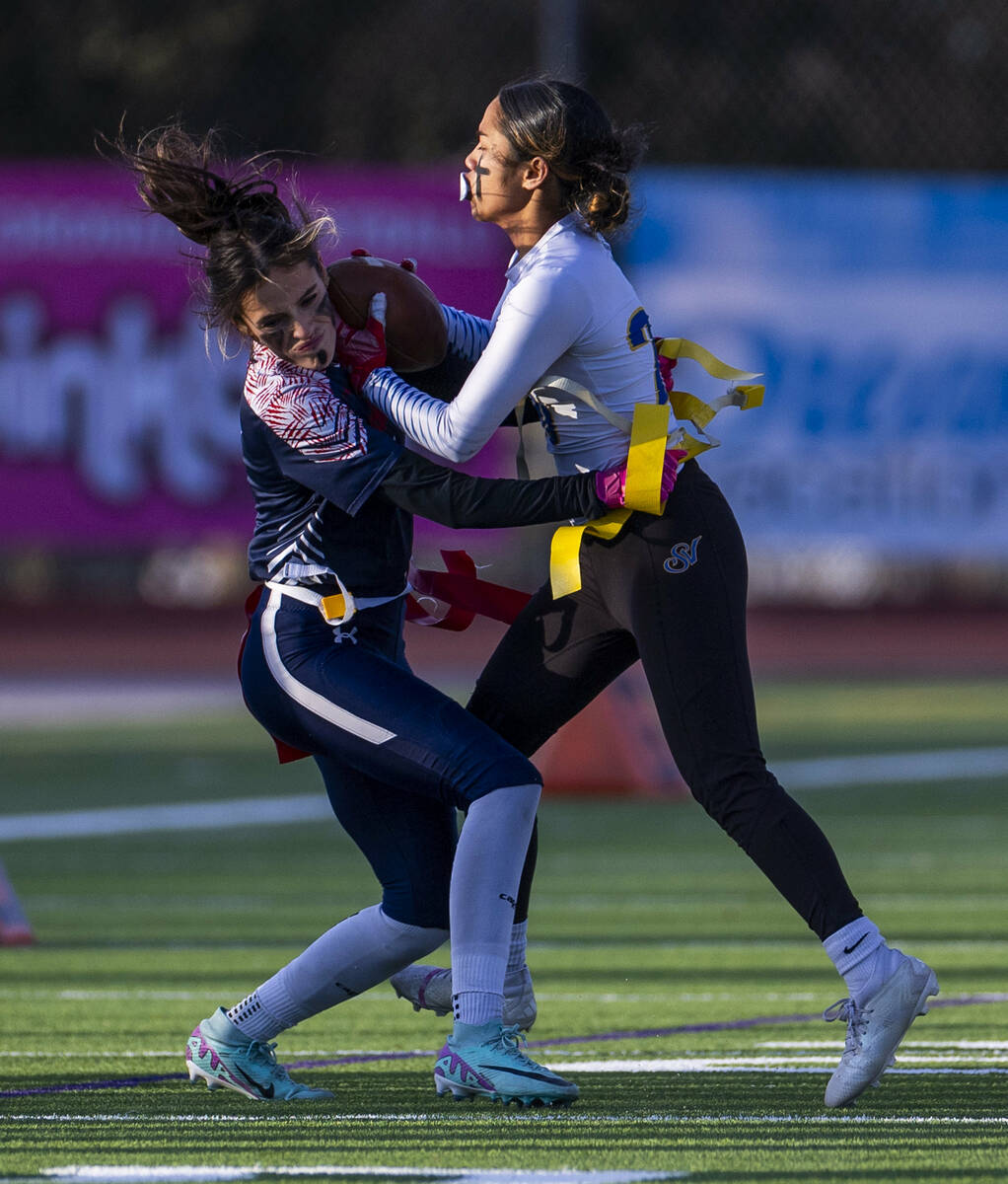 Coronado safety Mia Schlachter (7) collides with Sierra Vista runner Mary Agnes Kahawaii Pula (20) as she pulls her flag during the first half of their Class 4A flag football state quarterfinals game at Coronado High School on Wednesday, Feb. 12, 2025 in Henderson (L.E. Baskow/Las Vegas Review-Journal) @Left_Eye_Images
