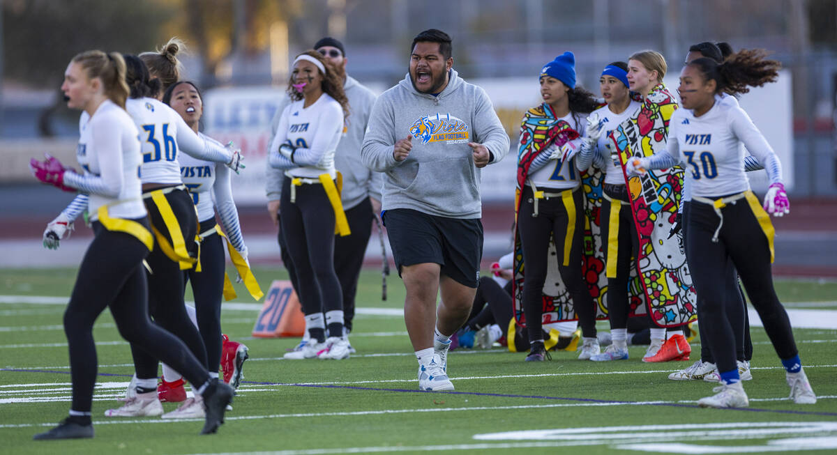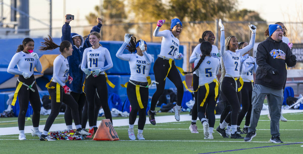 Sierra Vista players and coaches celebrate another stop over Coronado during the first half of their Class 4A flag football state quarterfinals game at Coronado High School on Wednesday, Feb. 12, 2025 in Henderson (L.E. Baskow/Las Vegas Review-Journal) @Left_Eye_Images
