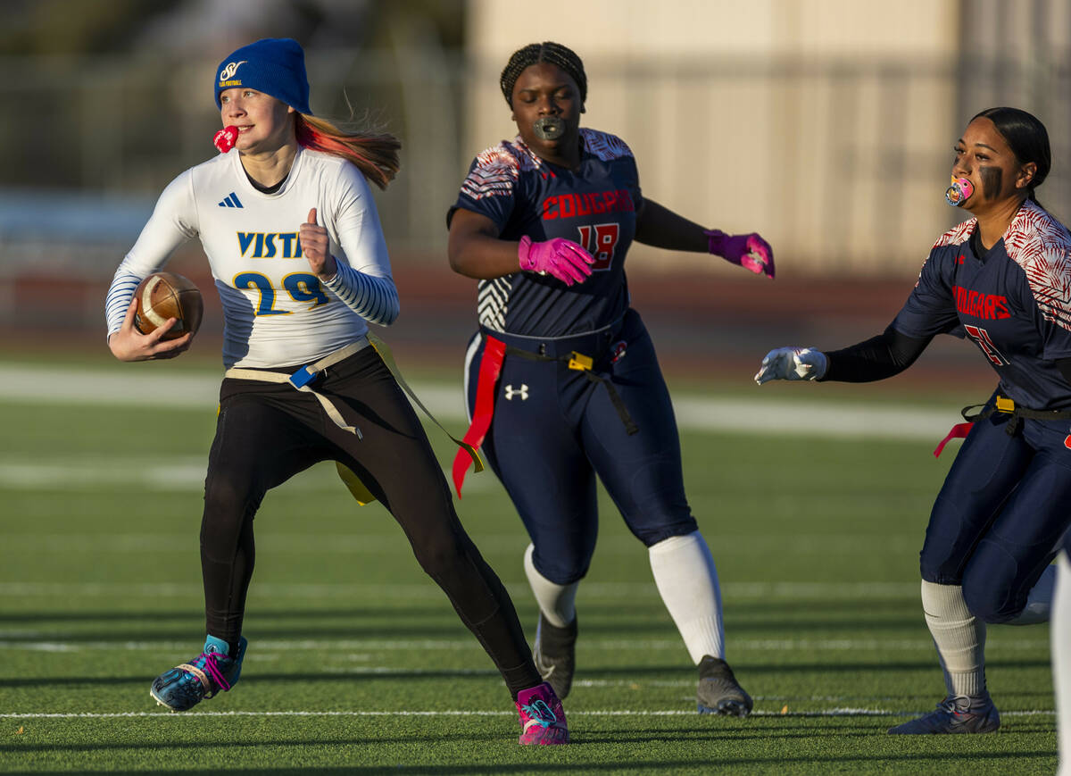 Sierra Vista quarterback Amaya Wusstig (29) evades Coronado linebacker Tielua Baptista (21) and linebacker Sykiya Tatum (18) during the first half of their Class 4A flag football state quarterfinals game at Coronado High School on Wednesday, Feb. 12, 2025 in Henderson (L.E. Baskow/Las Vegas Review-Journal) @Left_Eye_Images