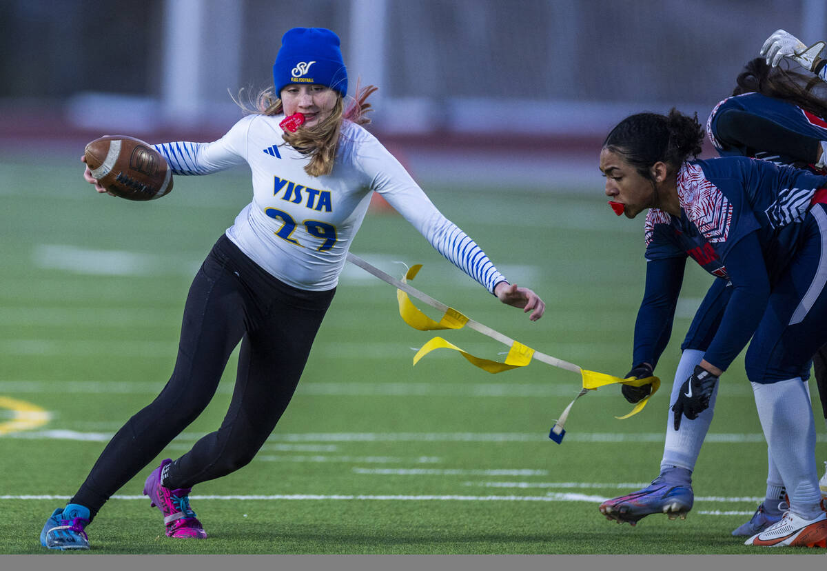 Sierra Vista runner Mary Agnes Kahawaii Pula (20) looks to evade a stop by linebacker Samia Linton-Rivera (20) during the first half of their Class 4A flag football state quarterfinals game at Coronado High School on Wednesday, Feb. 12, 2025 in Henderson (L.E. Baskow/Las Vegas Review-Journal) @Left_Eye_Images