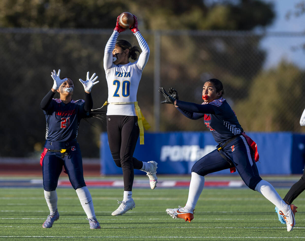 Sierra Vista runner Mary Agnes Kahawaii Pula (20) elevates for a catch over Coronado linebacker Tielua Baptista (21) and linebacker Samia Linton-Rivera (20) during the first half of their Class 4A flag football state quarterfinals game at Coronado High School on Wednesday, Feb. 12, 2025 in Henderson (L.E. Baskow/Las Vegas Review-Journal) @Left_Eye_Images