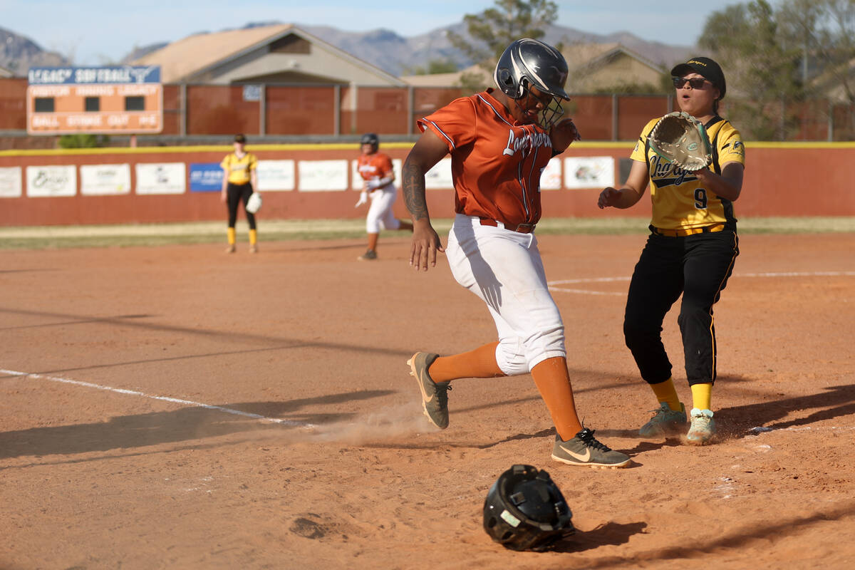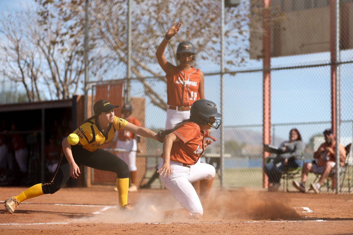Clark pitcher Noel Gregorich, left, reaches to tag Legacy’s Cassandra Arellano, center, out while she arrives to home plate safely during a high school softball game at Legacy High School on Wednesday, March 27, 2024, in North Las Vegas. (Ellen Schmidt/Las Vegas Review-Journal) @ellenschmidttt