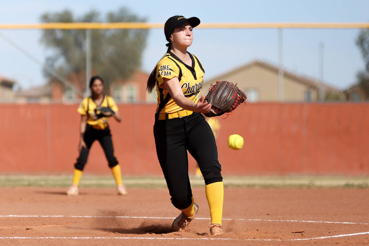 Clark pitcher Noel Gregorich throws to Legacy during a high school softball game at Legacy High School on Wednesday, March 27, 2024, in North Las Vegas. (Ellen Schmidt/Las Vegas Review-Journal) @ellenschmidttt