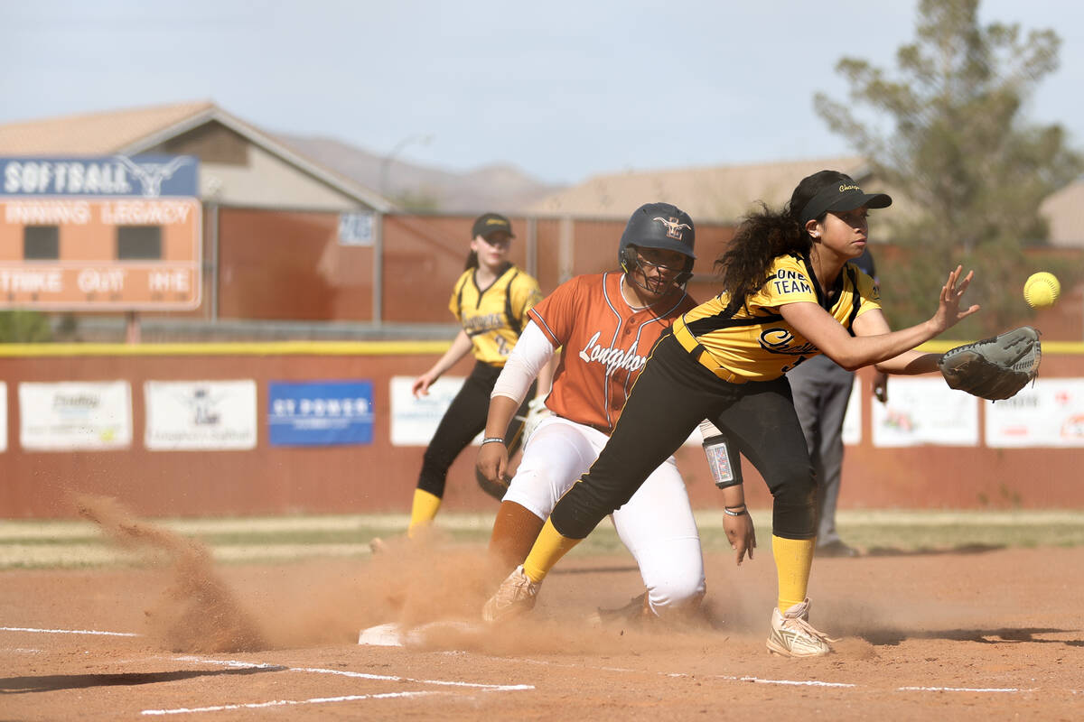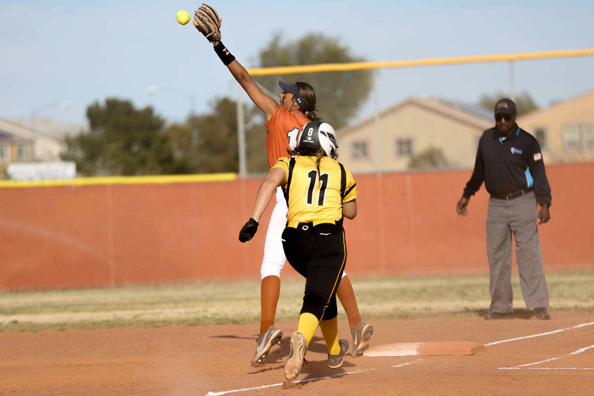 Legacy first baseman Madison Castellon reaches to catch for an out on Clark’s Paola Garcia (11) during a high school softball game at Legacy High School on Wednesday, March 27, 2024, in North Las Vegas. (Ellen Schmidt/Las Vegas Review-Journal) @ellenschmidttt