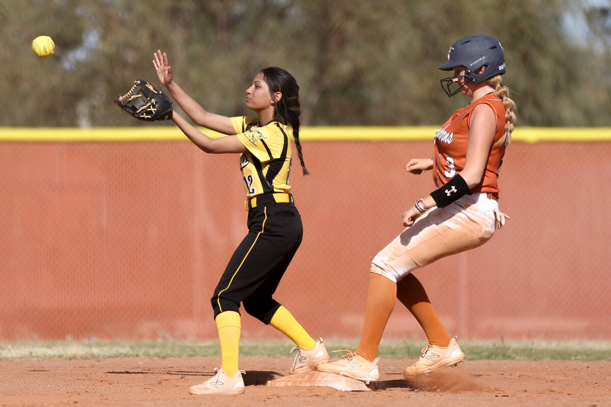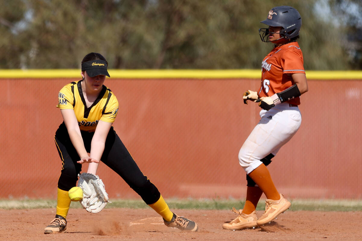 Clark’s Britney Kapugama (12) prepares to catch while Legacy second baseman Rylee Madden (3) makes it to second base during a high school softball game at Legacy High School on Wednesday, March 27, 2024, in North Las Vegas. (Ellen Schmidt/Las Vegas Review-Journal) @ellenschmidttt
