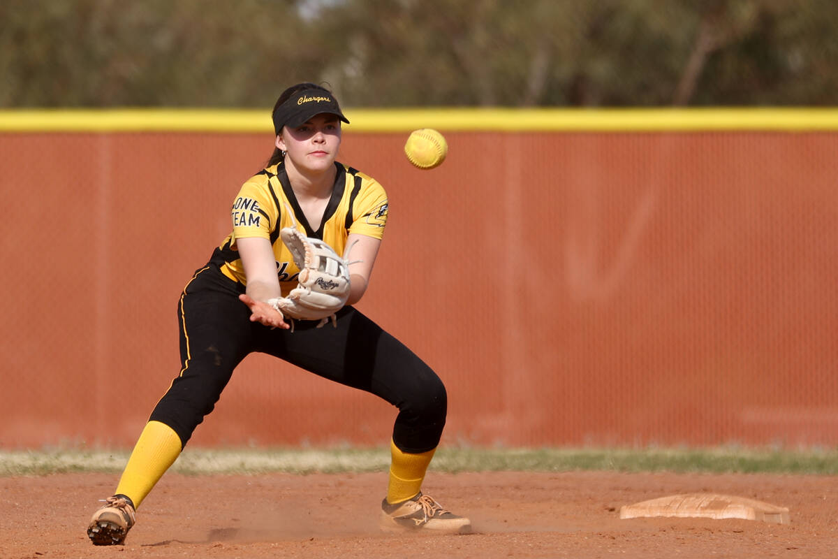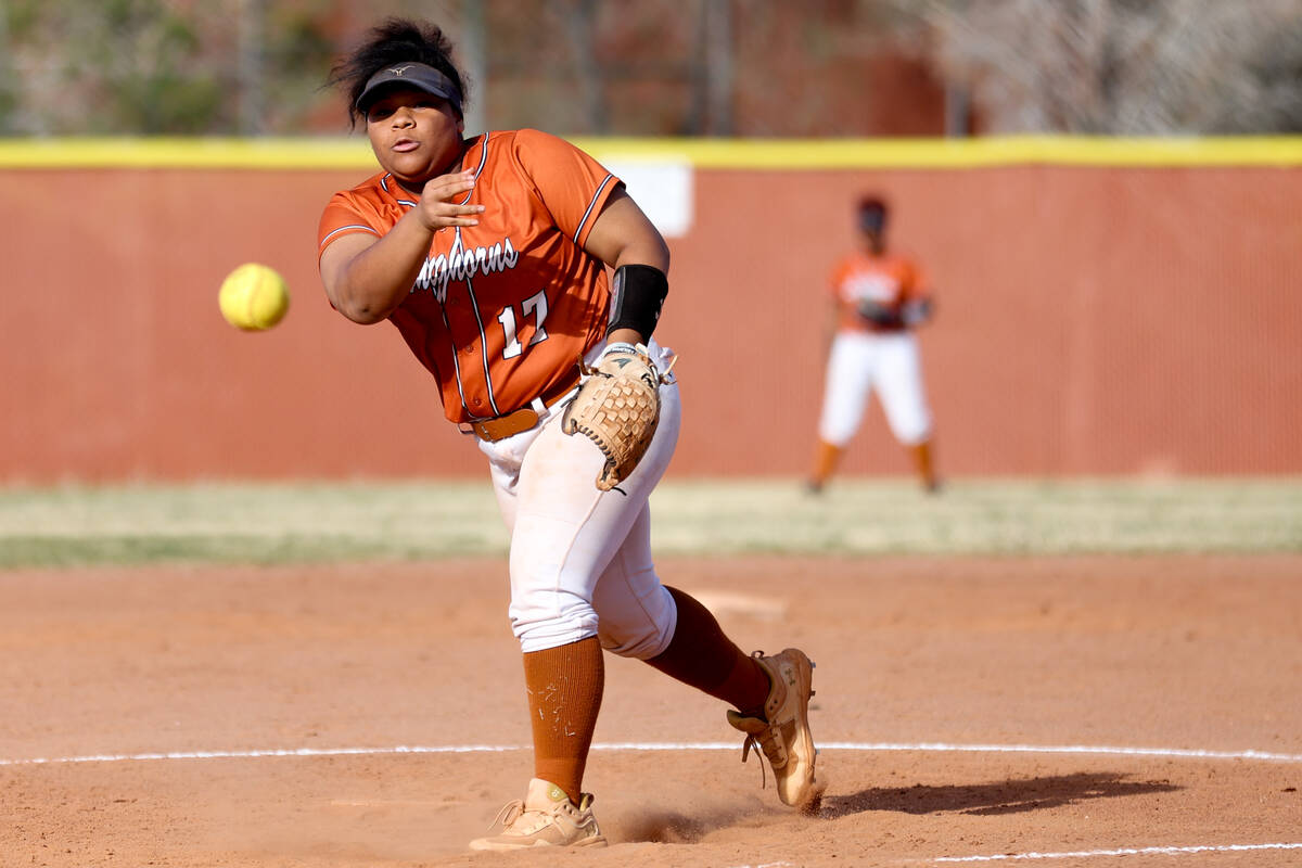 Legacy pitcher Nadia Armstrong throws to Clark during a high school softball game at Legacy High School on Wednesday, March 27, 2024, in North Las Vegas. (Ellen Schmidt/Las Vegas Review-Journal) @ellenschmidttt
