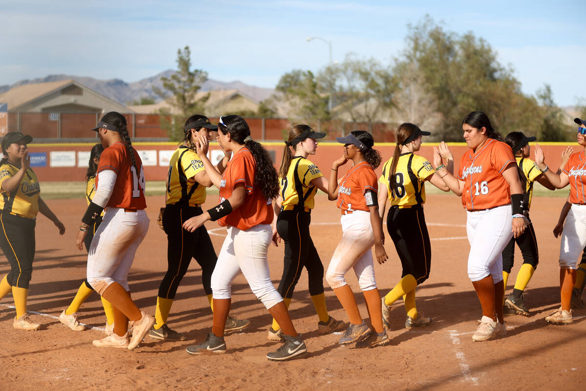Legacy high fives Clark after winning a high school softball game at Legacy High School on Wednesday, March 27, 2024, in North Las Vegas. (Ellen Schmidt/Las Vegas Review-Journal) @ellenschmidttt