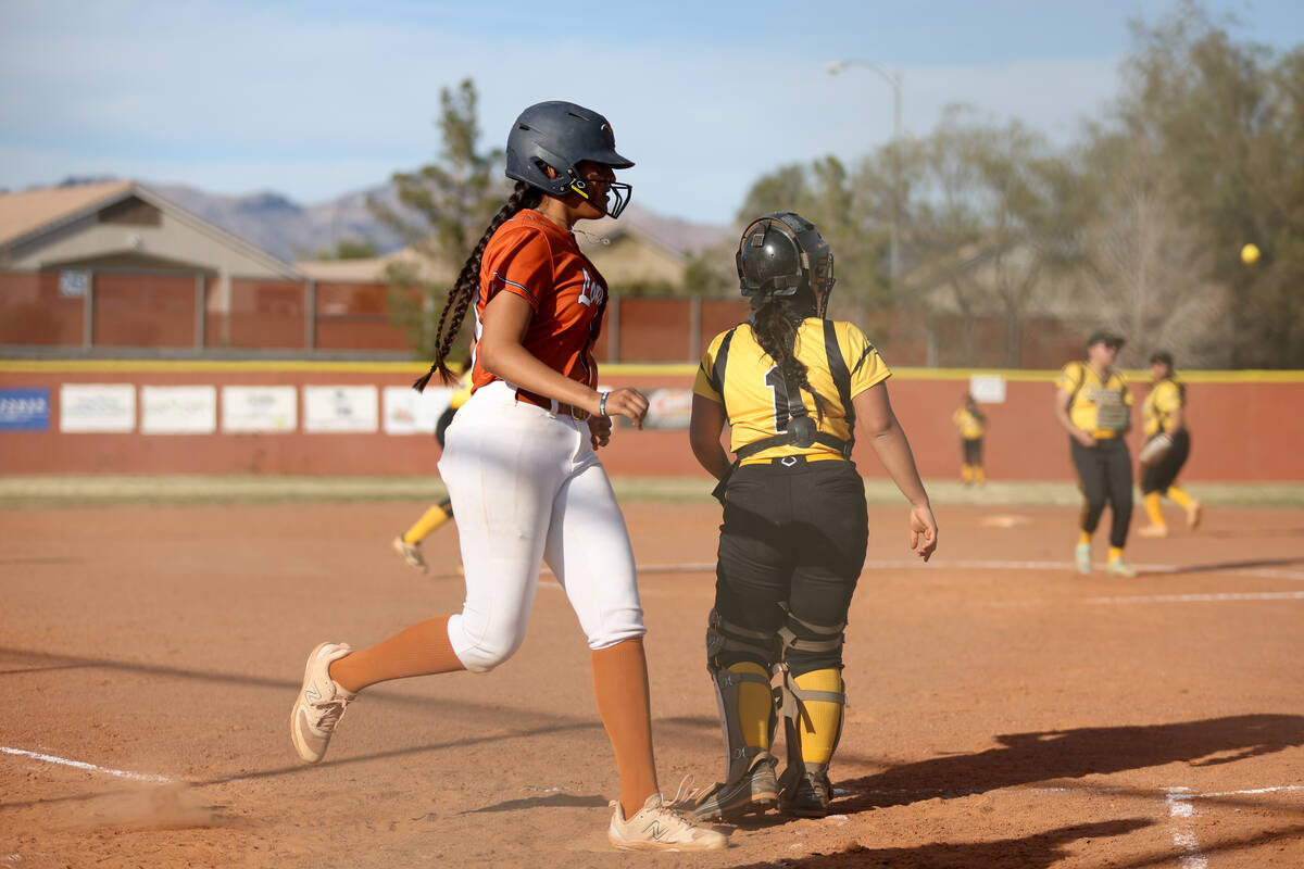 Legacy infielder Fernanda Barrios (10) scores as home plate while Clark catcher Sandra Peredes (1) anticipates the ball during a high school softball game at Legacy High School on Wednesday, March 27, 2024, in North Las Vegas. (Ellen Schmidt/Las Vegas Review-Journal) @ellenschmidttt