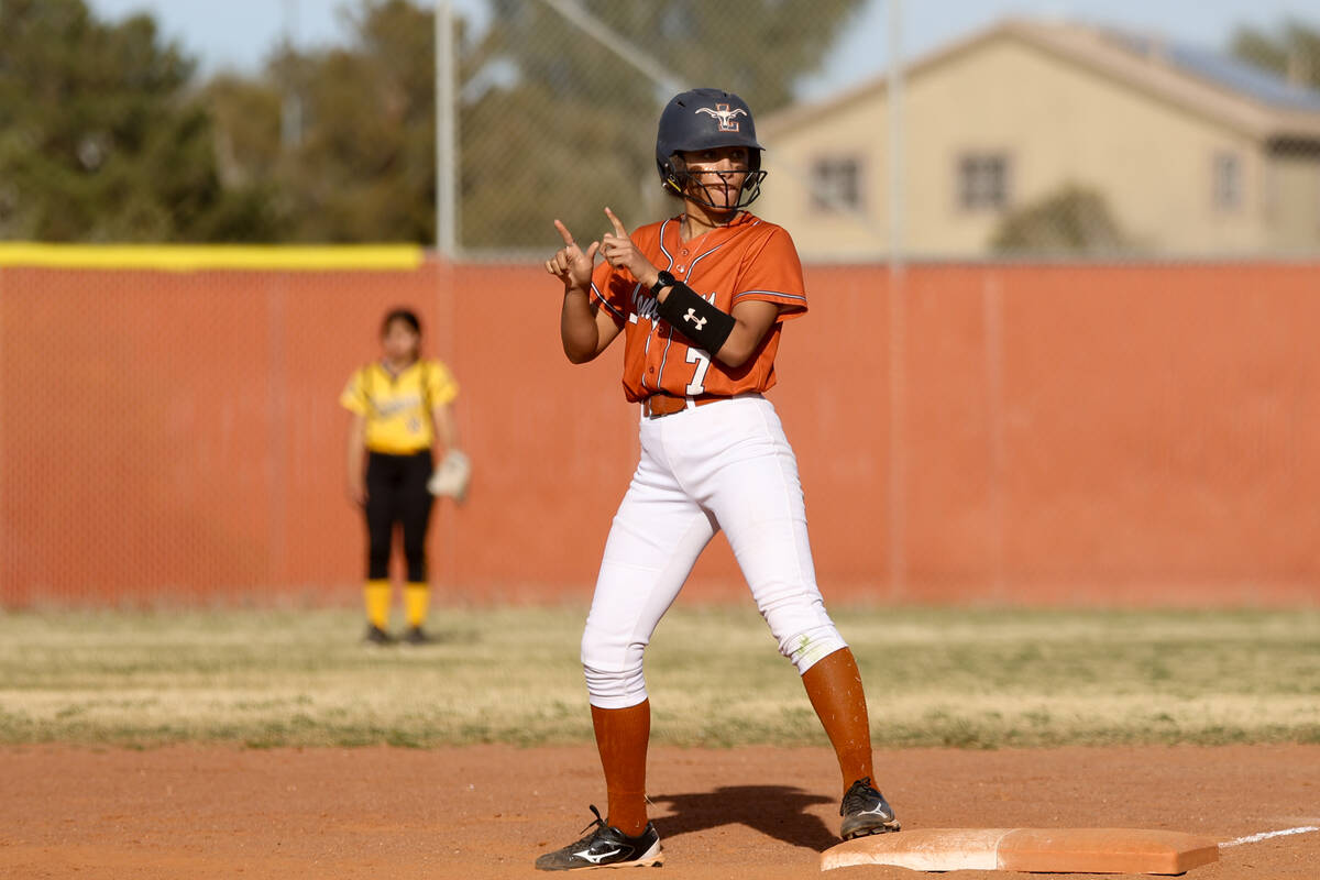 Legacy outfielder Ciara Batalion-Wright (7) dances after hitting a single during a high school softball game against Clark at Legacy High School on Wednesday, March 27, 2024, in North Las Vegas. (Ellen Schmidt/Las Vegas Review-Journal) @ellenschmidttt