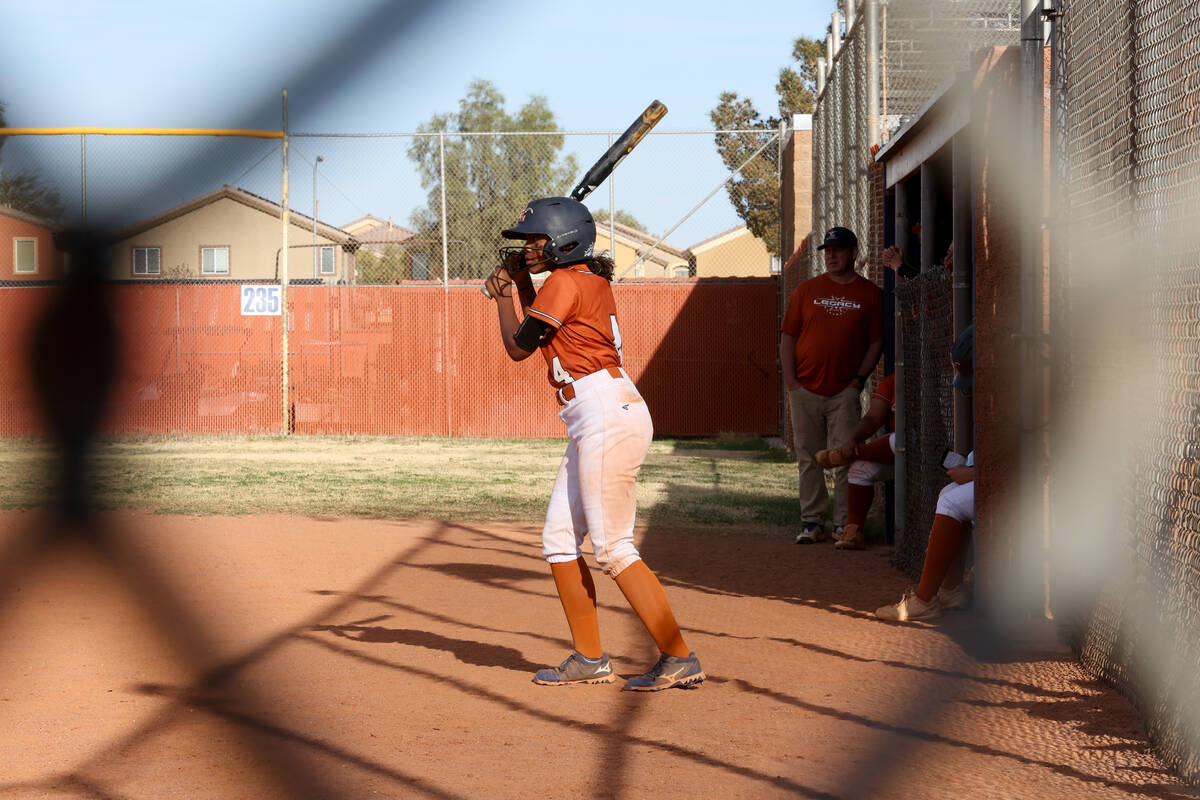 Legacy’s Madison Castellon (13) prepares to bat during a high school softball game against Clark at Legacy High School on Wednesday, March 27, 2024, in North Las Vegas. (Ellen Schmidt/Las Vegas Review-Journal) @ellenschmidttt