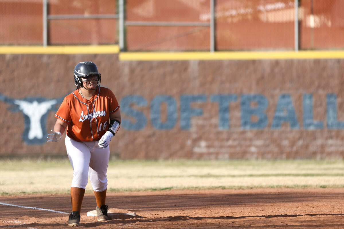 Legacy outfielder Nahara Gomez (18) prepares to run at third base during a high school softball game against Clark at Legacy High School on Wednesday, March 27, 2024, in North Las Vegas. (Ellen Schmidt/Las Vegas Review-Journal) @ellenschmidttt