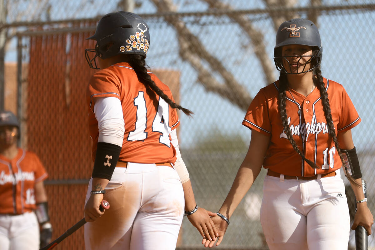 Legacy’s Aofia Noa (14) high fives infielder Fernanda Barrios (10) after scoring during a high school softball game against Clark at Legacy High School on Wednesday, March 27, 2024, in North Las Vegas. (Ellen Schmidt/Las Vegas Review-Journal) @ellenschmidttt
