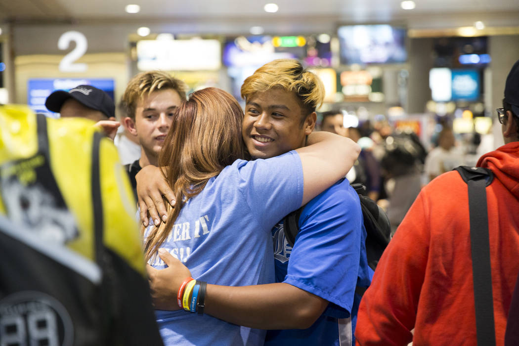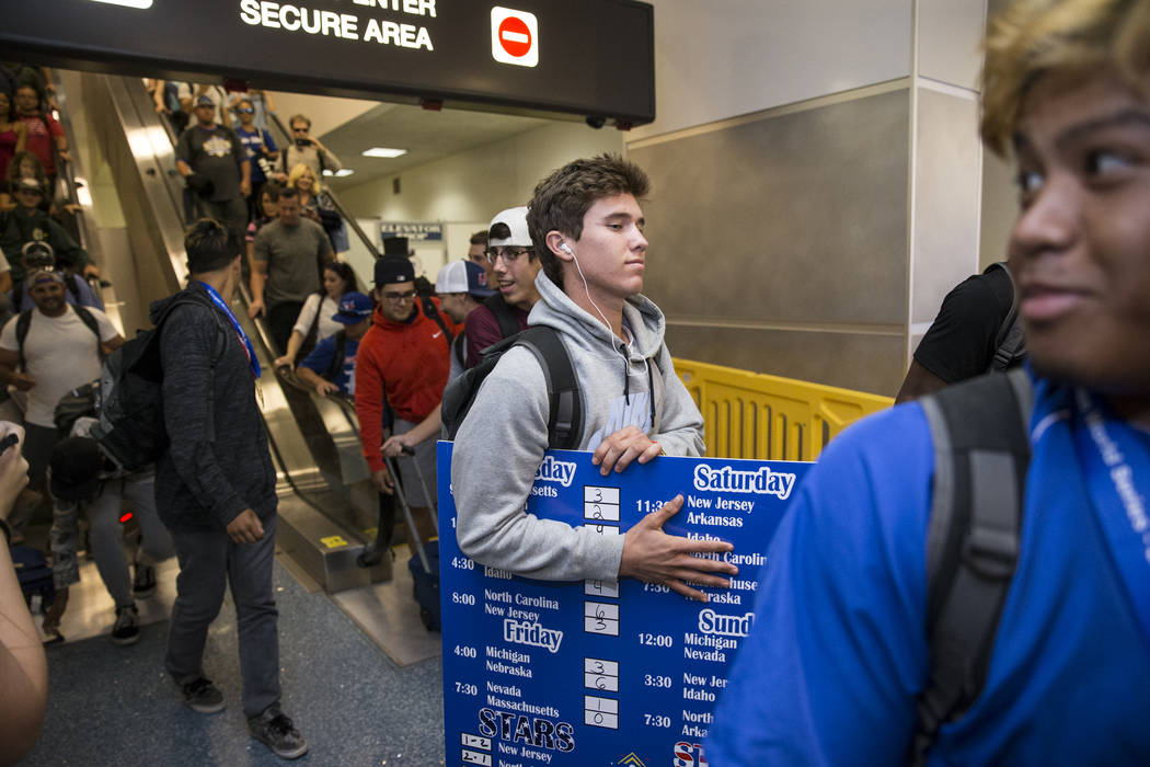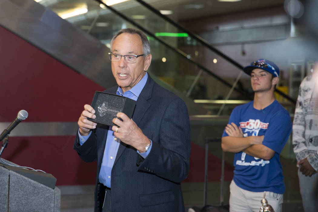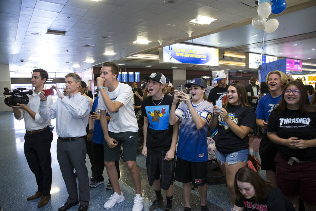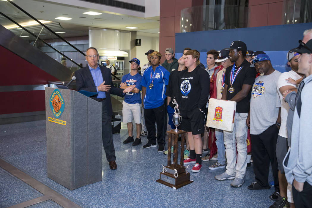 After fighting through the mob of people greeting them coming down the escalator out of the gate, Blue Sox coaches and players worked their way to a podium where Jim Gibson, county commissioner and former Henderson mayor, gave coach Scott Baker a proclamation making “Southern Nevada Blue Sox Day” official and presented the team with its keys.
