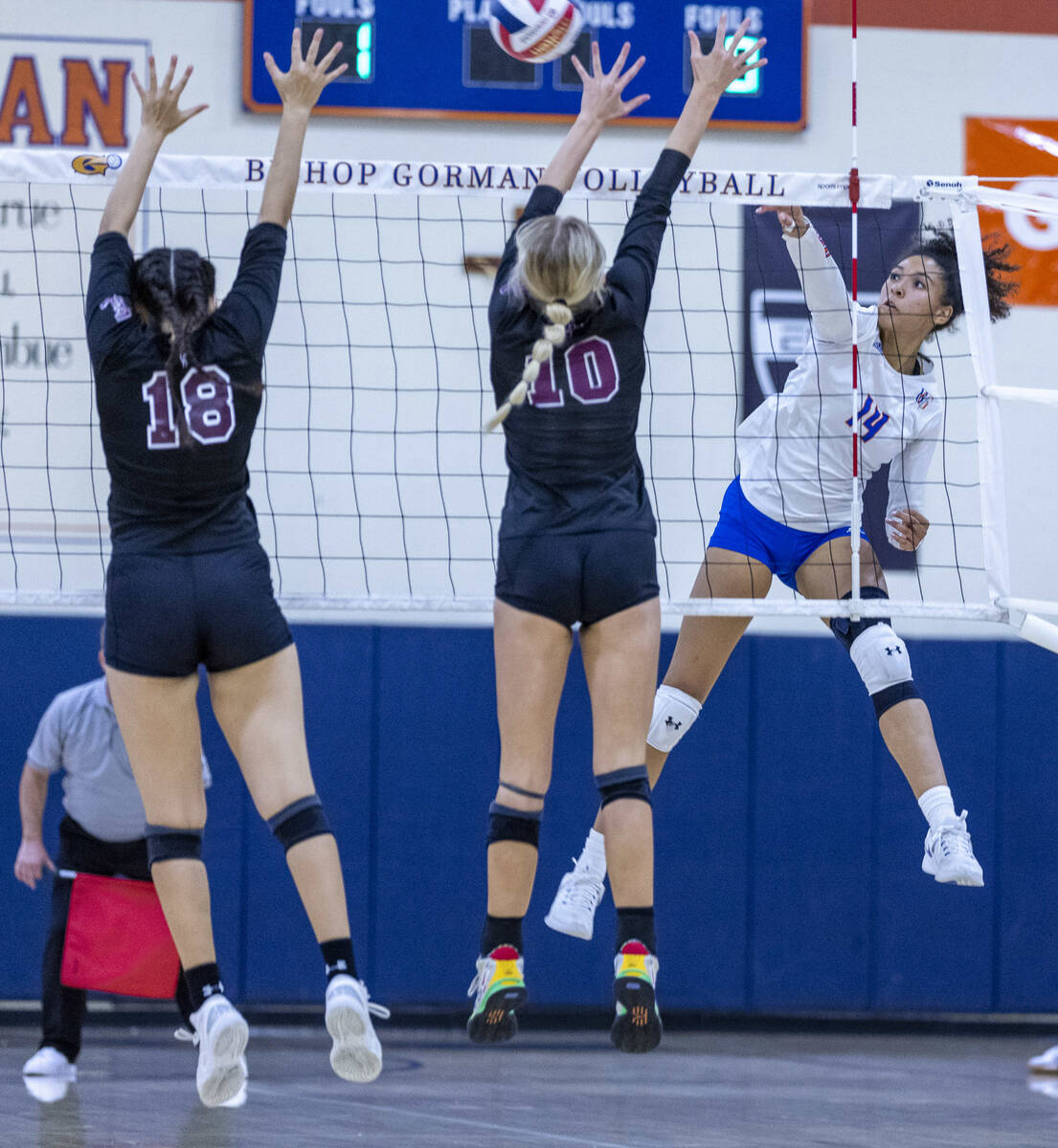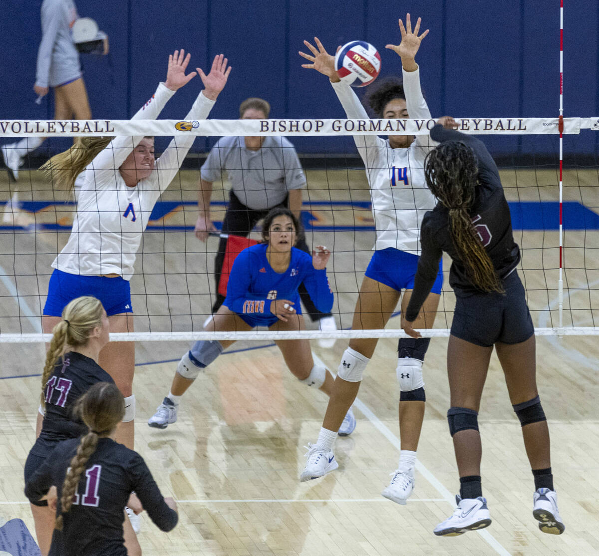 Bishop Gorman players look to block a shot by Faith Lutheran’s Italya Cloyd (5) during the second set of their NIAA volleyball match on Tuesday, Sept. 27, 2022, in Las Vegas. (L.E. Baskow/Las Vegas Review-Journal) @Left_Eye_Images