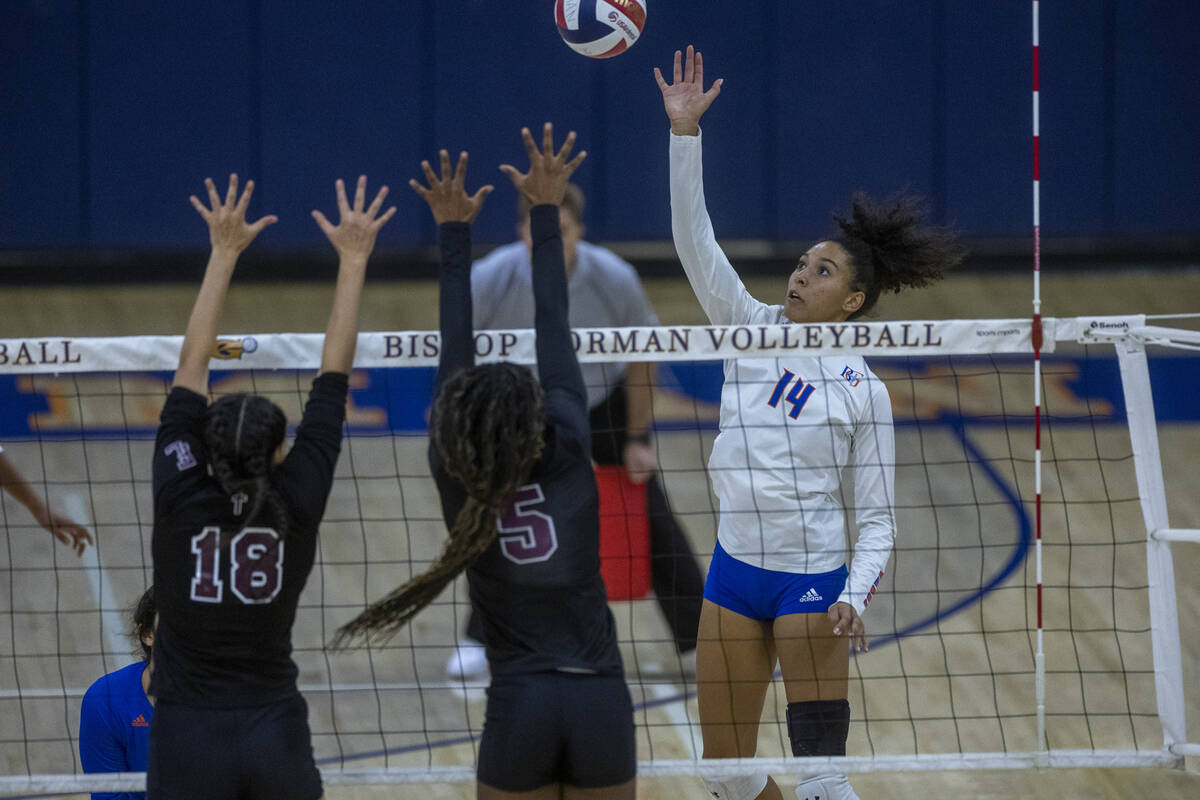 Bishop Gorman’s Ayanna Wastson (14) spikes the ball past Faith Lutheran’s Haylee Strong (18) and Ella Swinn (10) during the second set of their NIAA volleyball match on Tuesday, Sept. 27, 2022, in Las Vegas. (L.E. Baskow/Las Vegas Review-Journal) @Left_Eye_Images