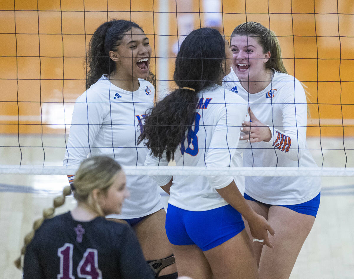 Bishop Gorman’s Leilia Toailoa (18) is congratulated by teammates on a kill shot past Faith Lutheran during the first set of their NIAA volleyball match on Tuesday, Sept. 27, 2022, in Las Vegas. (L.E. Baskow/Las Vegas Review-Journal) @Left_Eye_Images