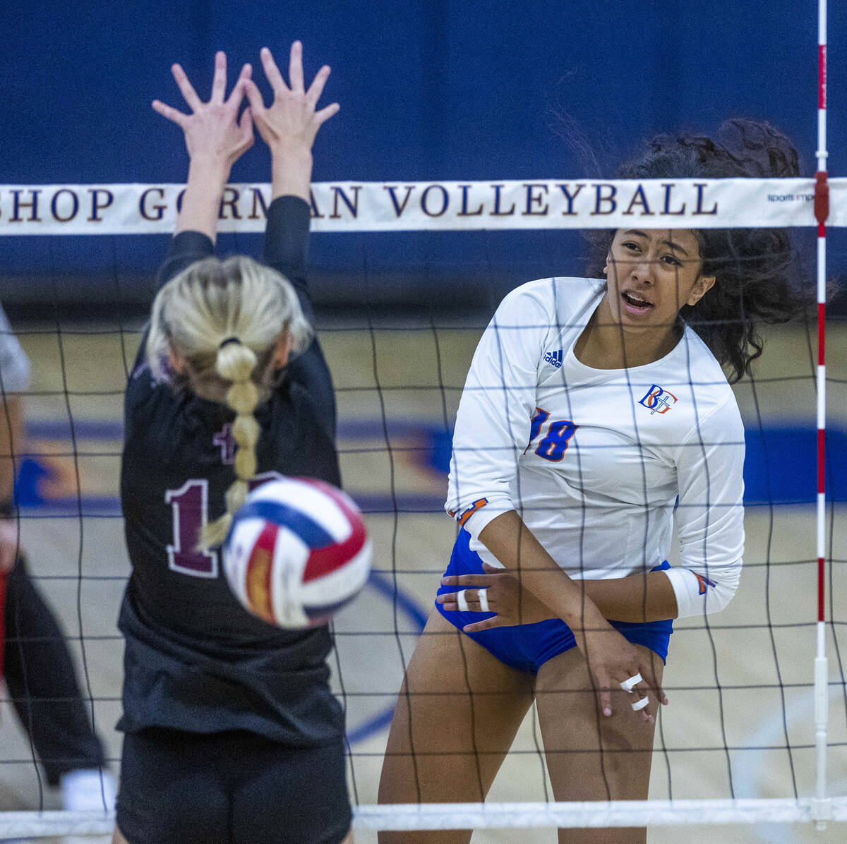 Bishop Gorman’s Leilia Toailoa (18) sends a shot past Faith Lutheran’s Ella Swinn (10) during the first set of their NIAA volleyball match on Tuesday, Sept. 27, 2022, in Las Vegas. (L.E. Baskow/Las Vegas Review-Journal) @Left_Eye_Images