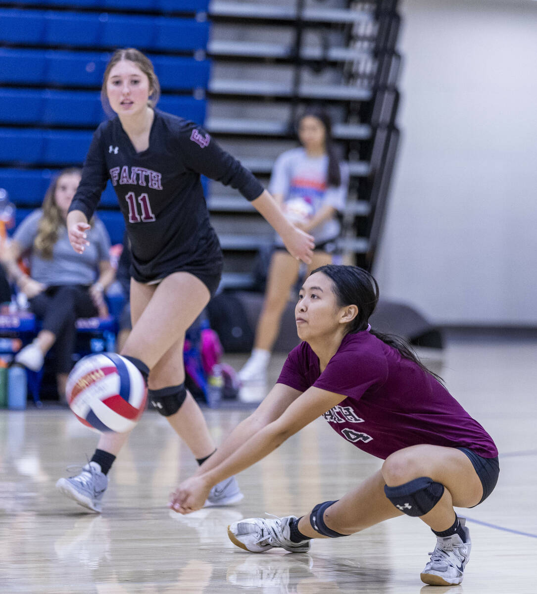 Faith Lutheran’s Kayla Tran (4) digs the ball out as teammate Olivia Faulis (11) looks on versus Bishop Gorman during the second set of their NIAA volleyball match on Tuesday, Sept. 27, 2022, in Las Vegas. (L.E. Baskow/Las Vegas Review-Journal) @Left_Eye_Images