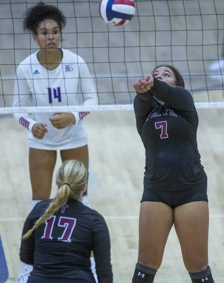 Faith Lutheran’s Kayleigh Kennedy (7) digs the ball out as Bishop Gorman’s Ayanna Wastson (14) looks on during the second set of their NIAA volleyball match on Tuesday, Sept. 27, 2022, in Las Vegas. (L.E. Baskow/Las Vegas Review-Journal) @Left_Eye_Images