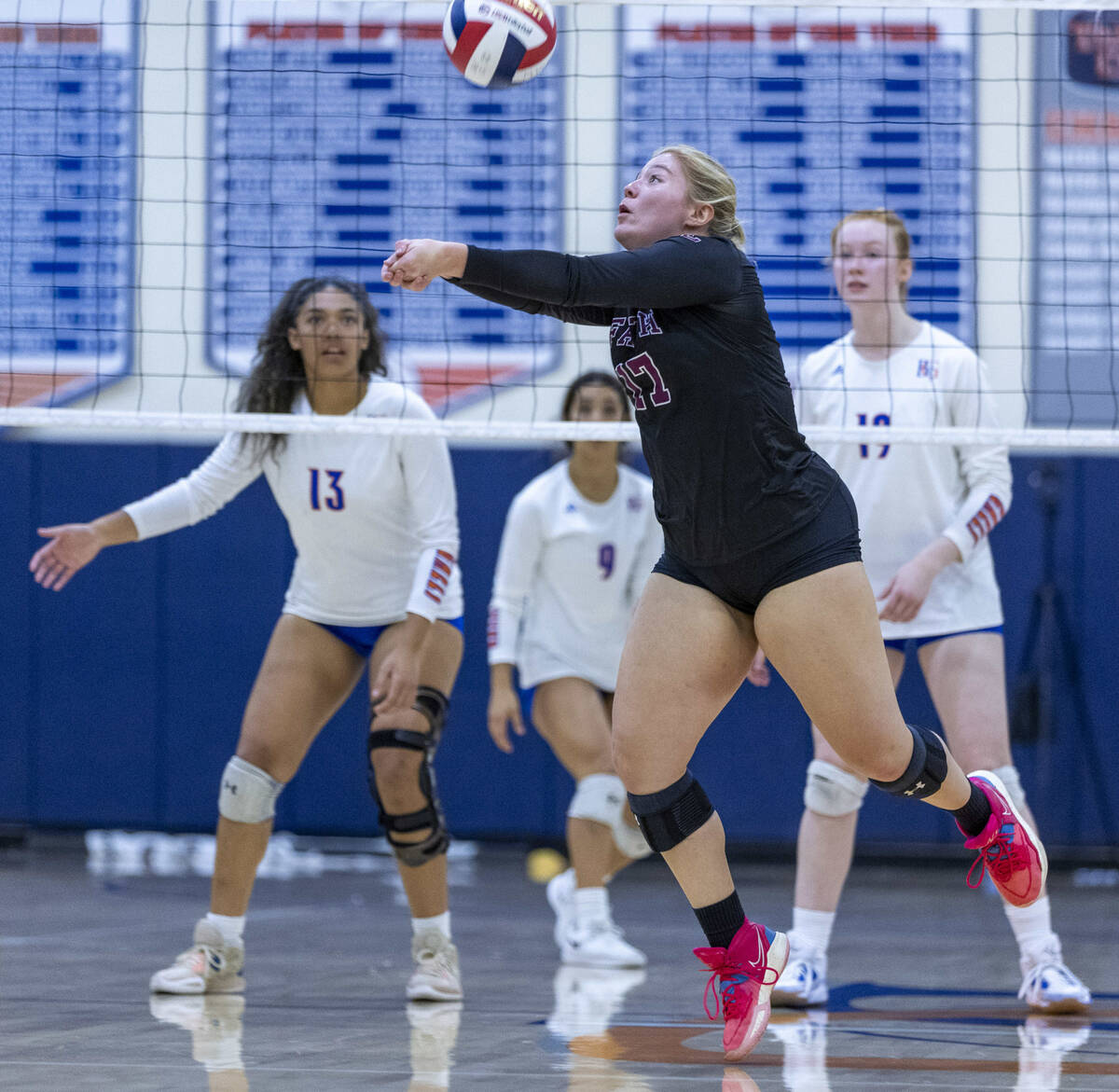 Faith Lutheran’s Savannah Wise (17) digs the ball out versus Bishop Gorman during the second set of their NIAA volleyball match on Tuesday, Sept. 27, 2022, in Las Vegas. (L.E. Baskow/Las Vegas Review-Journal) @Left_Eye_Images