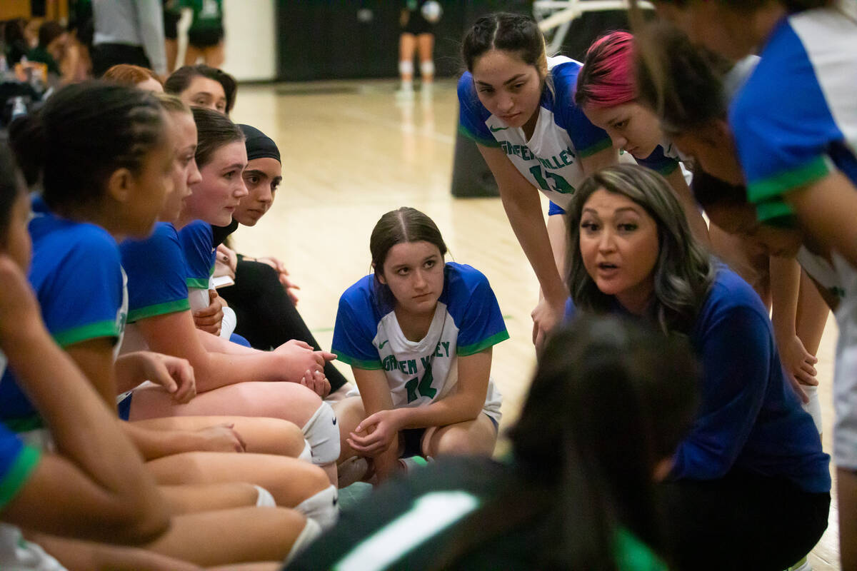 Green Valley team members listen to their coach in between sets at a volleyball game at Palo Verde high school on Tuesday, Oct. 11, 2022, in Las Vegas. (Amaya Edwards/Las Vegas Review-Journal) @amayaedw5