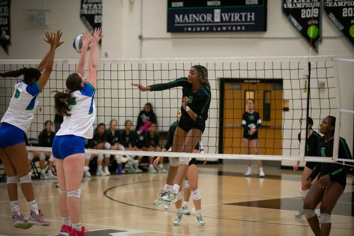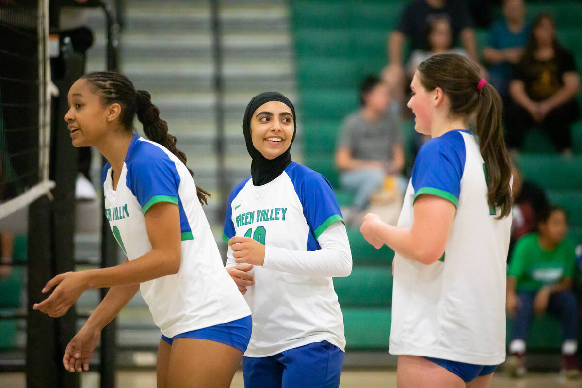 Green Valley’s Aby Tibesar-Magassa (8), Aiyana Alchawa (10) and Lily Meyers (14) during a girls volleyball match at Palo Verde high school on Tuesday, Oct. 11, 2022, in Las Vegas. (Amaya Edwards/Las Vegas Review-Journal) @amayaedw5