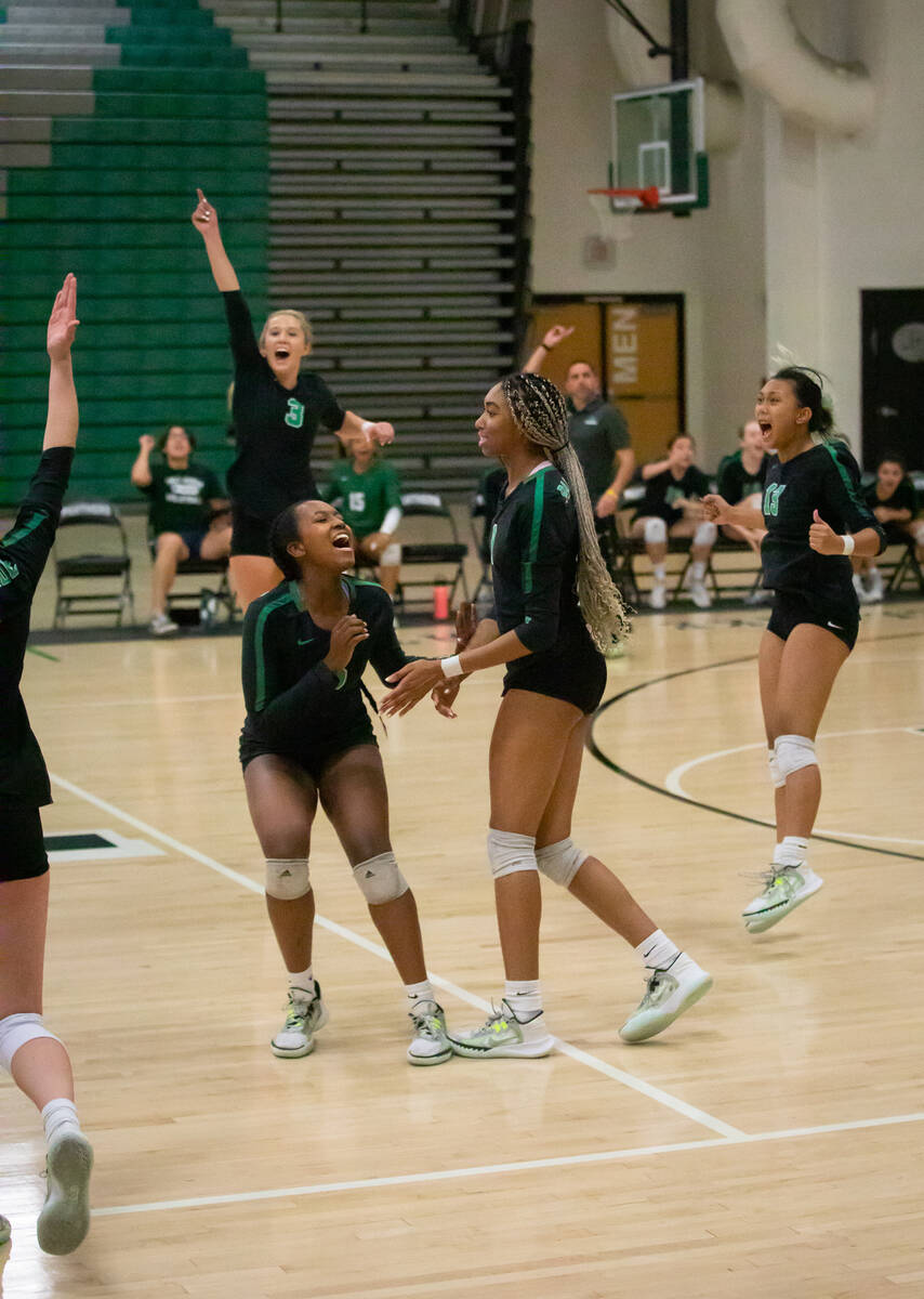 Green Valley’s Ensilina Savelio (6) cheers with her team mates during a volleyball game at Palo Verde high school on Tuesday, Oct. 11, 2022, in Las Vegas. (Amaya Edwards/Las Vegas Review-Journal) @amayaedw5