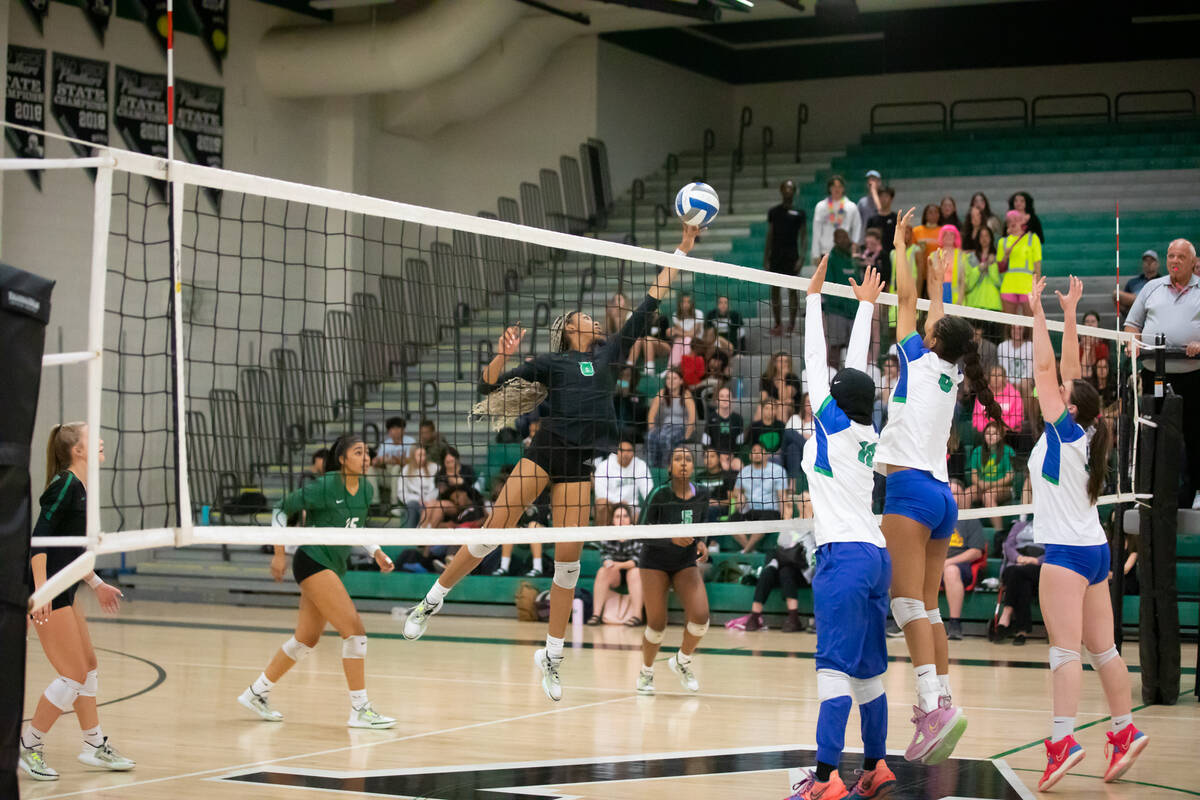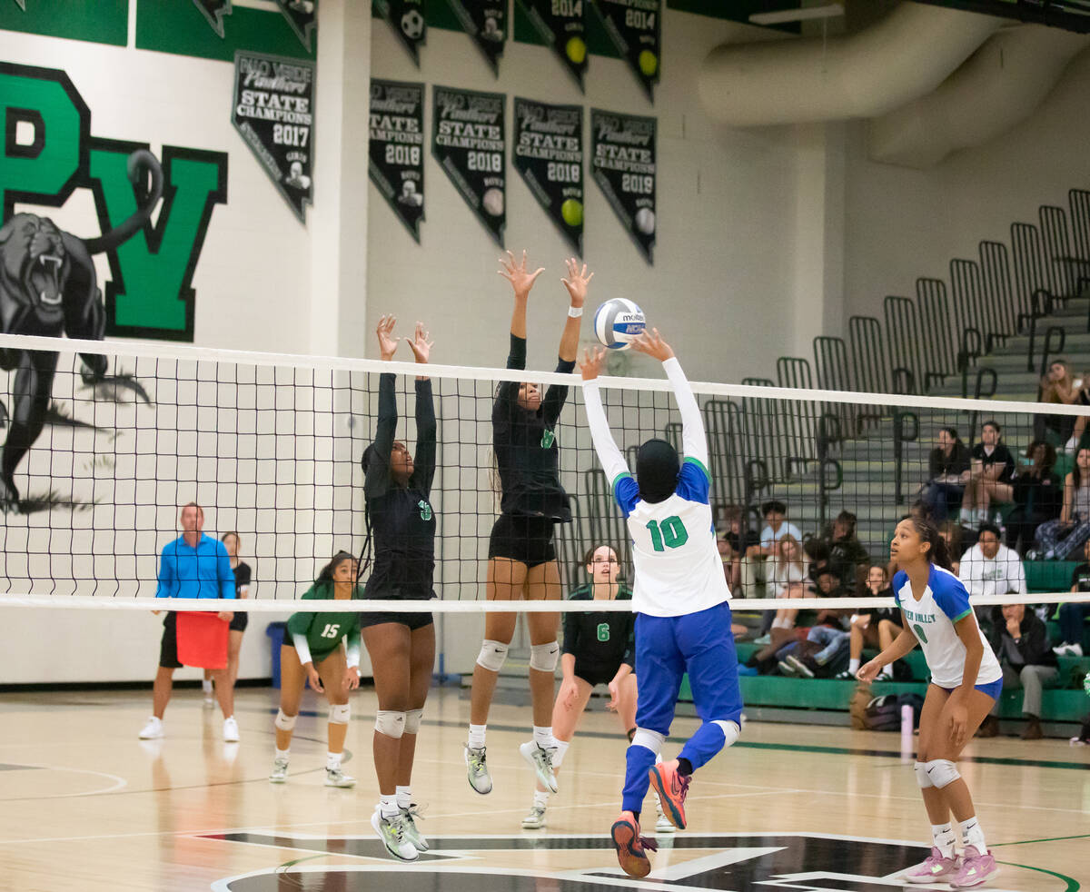 Green Valley’s Aby Tibesar-Magassa (8) blocks the ball during a girls volleyball match at Palo Verde high school on Tuesday, Oct. 11, 2022, in Las Vegas. (Amaya Edwards/Las Vegas Review-Journal) @amayaedw5