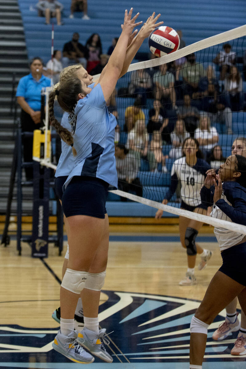 Shadow Ridge’s Jyniah Sanders (14) and Lexi Luszeck (9) try to block a Foothill hit during their match at Foothill High School on Thursday, Sept. 15, 2022, in Henderson. (Steel Brooks/Las Vegas Review-Journal)