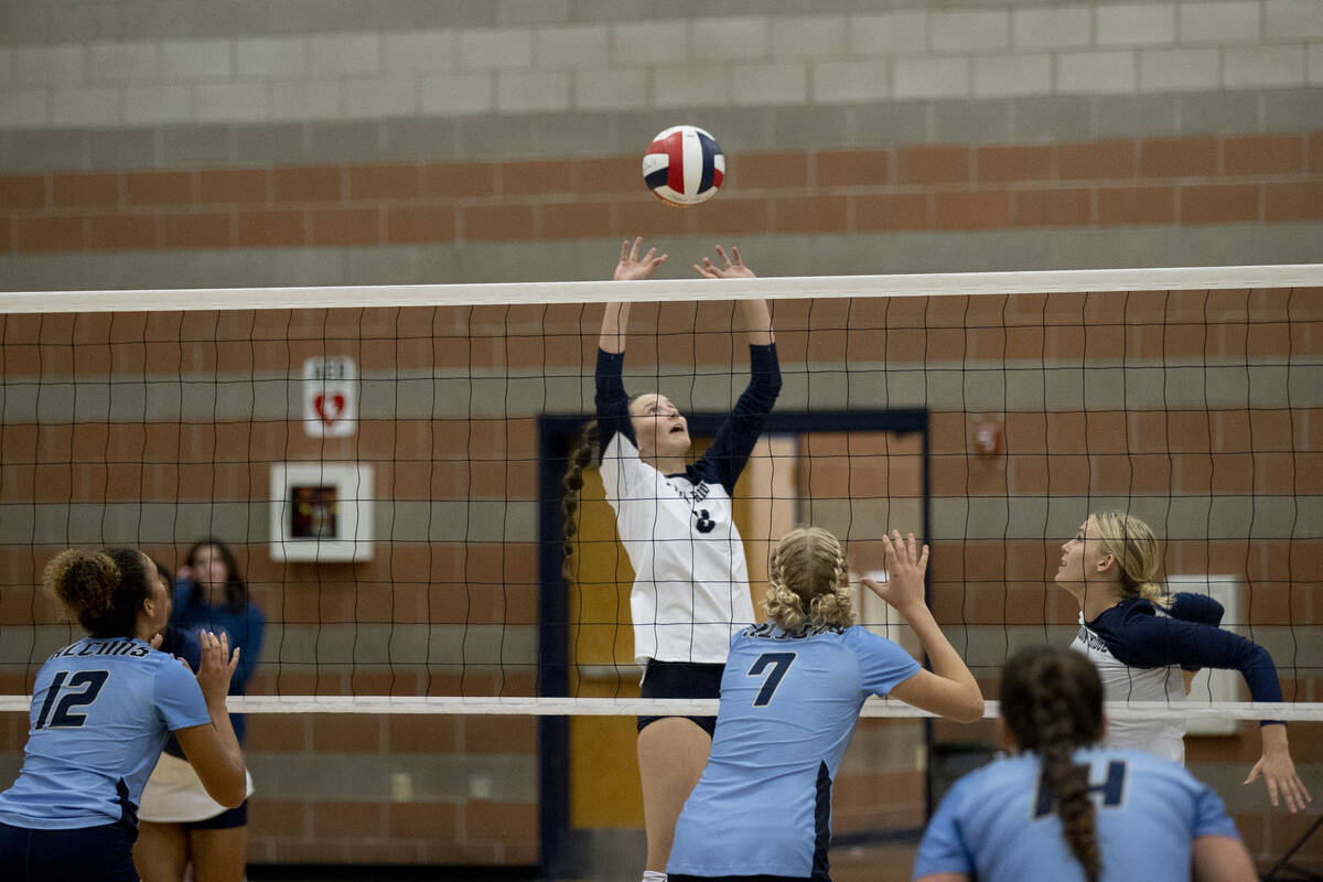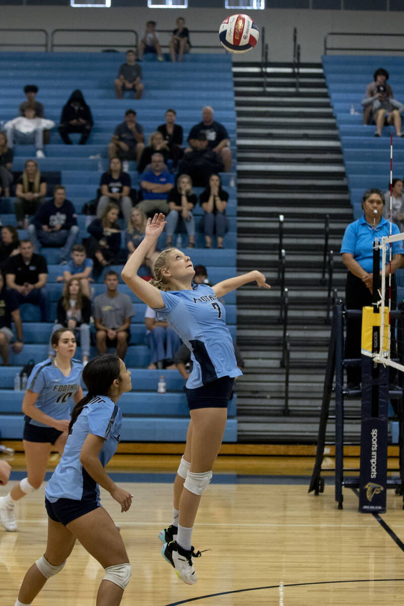 Foothill’s Katie Kaepp (4) goes up for a hit against Foothill High School on Thursday, Sept. 15, 2022, in Henderson. (Steel Brooks/Las Vegas Review-Journal)
