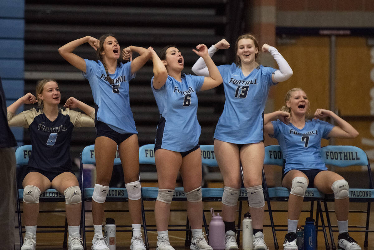 Foothill’s Sally Heagany (8), Madison Holmes (5), Morgan Fleisher (6), Bella Riggs (13) and Madelyn Neibaur (7) cheer on their teammates from the bench during their match against Shadow Ridge on Thursday, Sept. 15, 2022, in Henderson. (Steel Brooks/Las Vegas Review-Journal)