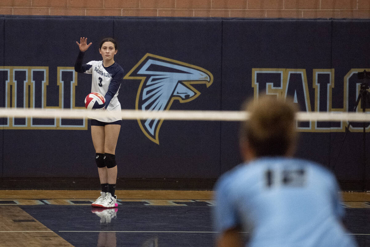 Shadow Ridge’s Elaina Smith (3) prepares to serve against Foothill High School on Thursday, Sept. 15, 2022, in Henderson. (Steel Brooks/Las Vegas Review-Journal)