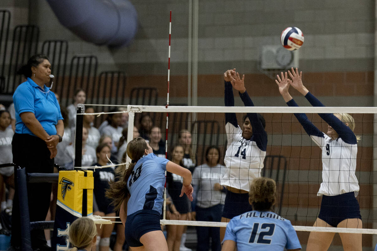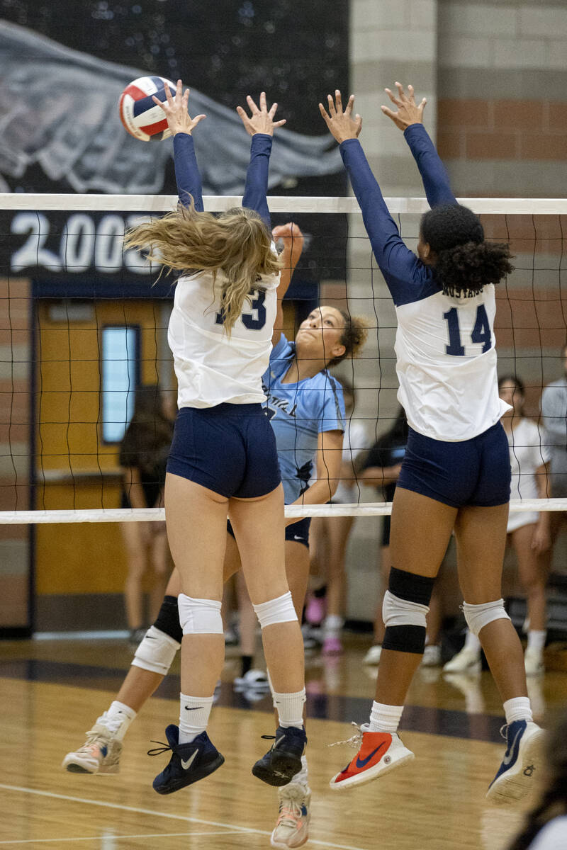 Shadow Ridge’s Jyniah Sanders (14) and Elaina Smith (3) block a hit from Foothill’s Maleya Miles (12) at Foothill High School on Thursday, Sept. 15, 2022, in Henderson. (Steel Brooks/Las Vegas Review-Journal)