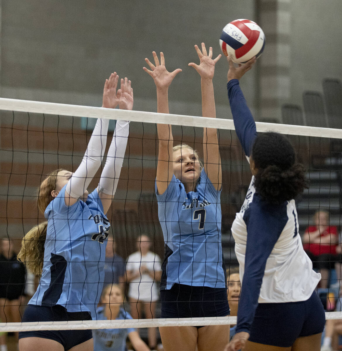 Shadow Ridge’s Riah Thurston (13) makes a block during their match against Foothill High School on Thursday, Sept. 15, 2022, in Henderson. (Steel Brooks/Las Vegas Review-Journal)