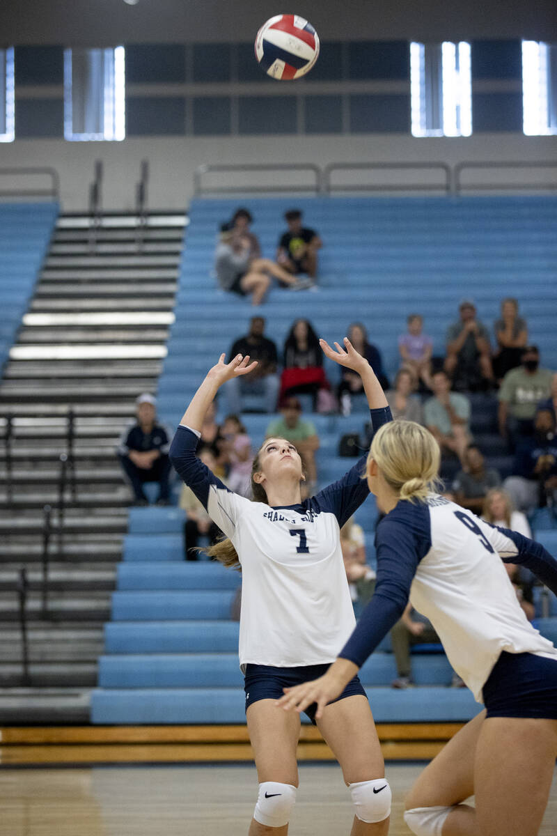 Shadow Ridge’s Madi Miller (7) sets the ball for an attach during their game against Foothill High School on Thursday, Sept. 15, 2022, in Henderson. (Steel Brooks/Las Vegas Review-Journal)