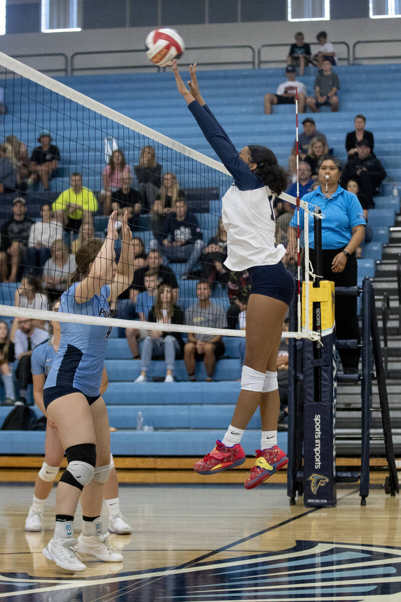 Shadow Ridge’s Riah Thurston (13) goes up for a hit at the net against Foothill High School on Thursday, Sept. 15, 2022, in Henderson. (Steel Brooks/Las Vegas Review-Journal)