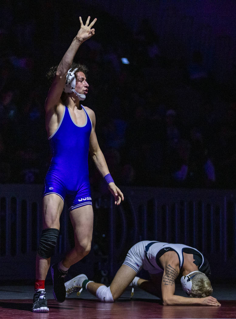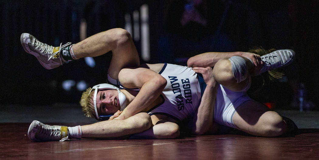 Weston Presser and Noah Gallardo won state titles for Shadow Ridge. Presser led 11-1 against Green Valley’s Jeremy Hoffman before holding on for a 13-9 win at 145. Gallardo took control early against Cimarron-Memorial’s Jayden Johnson at 182 en route to a 15-4 major decision.