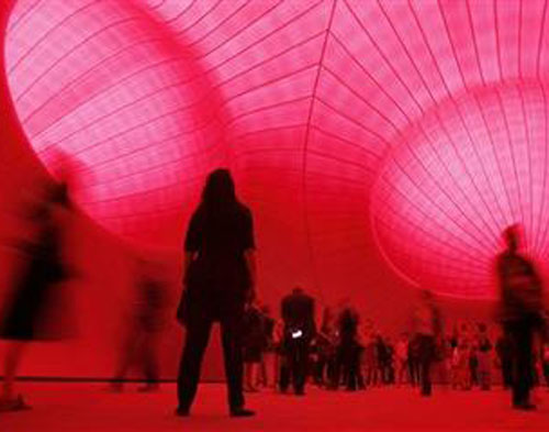 PARIS (AP) -- A blood-colored, globulous balloon ensconced in Paris' Grand Palais seems to suck you into its vortex as you lose your sense of balance. And that's not such a bad thing. The city's latest monumental exhibit, by Anish Kapoor, is at once enveloping and vertigo-inducing, and as often with the outspoken British artist, political. Kapoor dedicated it to jailed Chinese artist and government critic Ai Weiwei.