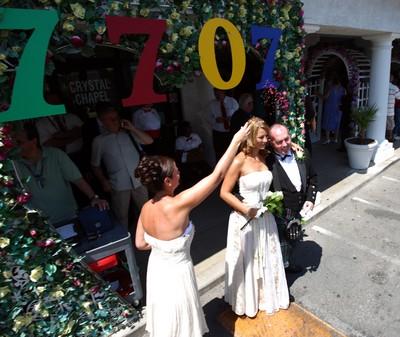 Let the rest of the world spend the day worrying about global warming. This is Las Vegas, where two of its signature activities -- gambling and fast weddings -- got a boost on Saturday from triple sevens.