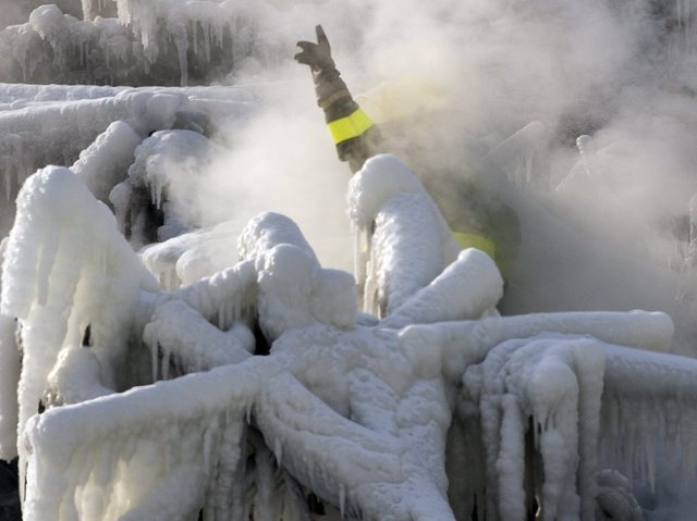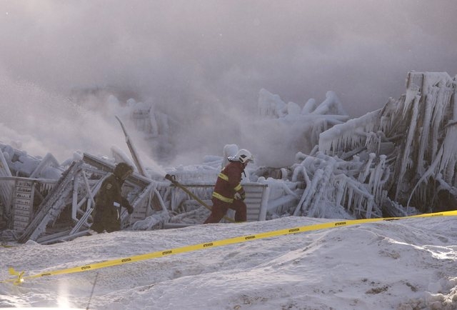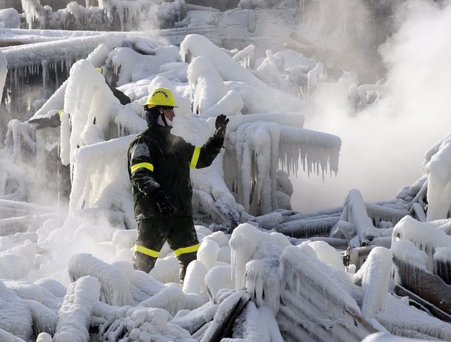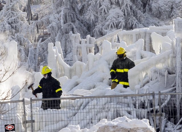 The spray from firefighters’ hoses left the senior citizens home resembling a macabre snow palace, the ruins encased in thick white ice dripping with icicles.