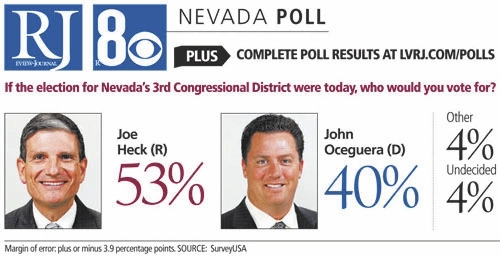 Heck also leads Oceguera among swing independent voters in the 3rd Congressional District, the state's most competitive because it is evenly divided between registered Republicans and Democrats.