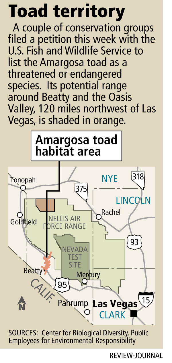 One of the most prominent of these critters, the Amargosa toad, again is caught between interests in Nye County to develop public land targeted for sale and efforts by two conservation groups to keep its fragile habitat intact around Beatty, 120 miles northwest of Las Vegas.