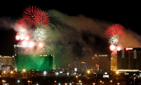 The Fremont Street Experience show featured fireworks under the canopy at midnight, but they were dwarfed by the fireworks display that launched from atop seven hotel rooftops along the Strip.