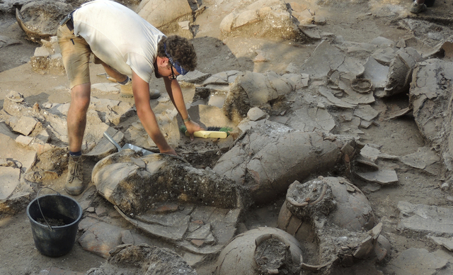 The wine cellar was found this summer in palace ruins near the modern town of Nahariya in northern Israel. Researchers found 40 ceramic jars, each big enough to hold about 13 gallons, in a single room. There may be more wine stored elsewhere, but the amount found so far wouldn’t be enough to supply the local population, which is why the researchers believe it was reserved for palace use, Cline said.