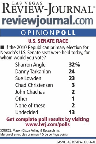 The poll shows Lowden with 29 percent of support of the GOP primary voters in Clark County, followed by Angle at 26 percent and Tarkanian at 24 percent.