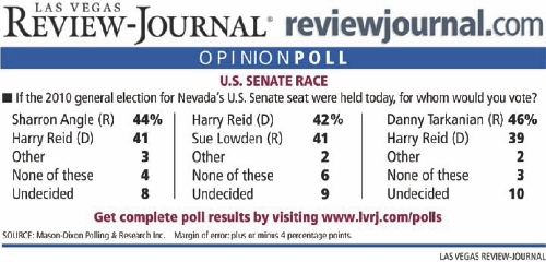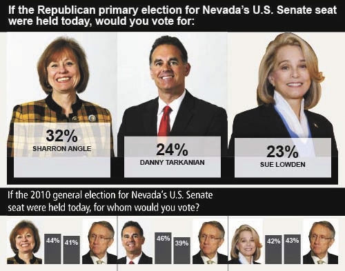 But the survey also found that if the general election were held today, Danny Tarkanian would have a slightly better chance than Angle to beat Democratic incumbent Harry Reid. Meanwhile, the fortunes of former front-runner and establishment pick Sue Lowden have fallen so far she now is in a statistical tie with Tarkanian and in a dead heat with the Senate majority leader.