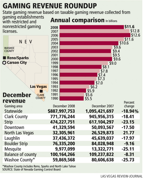 The year 2008 was the worst on record for declining gaming revenues in Nevada, falling nearly 10 percent for the year -- and a whopping 18.9 percent just in the fourth quarter.
