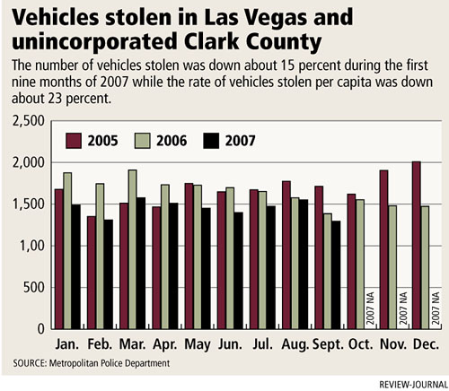 North Las Vegas also saw a decrease in auto thefts. Officer Sean Walker, spokesman for the department, said auto theft there dropped about 13 percent from Jan. 1, 2007 to Sept. 30, 2007 compared with the same time last year.