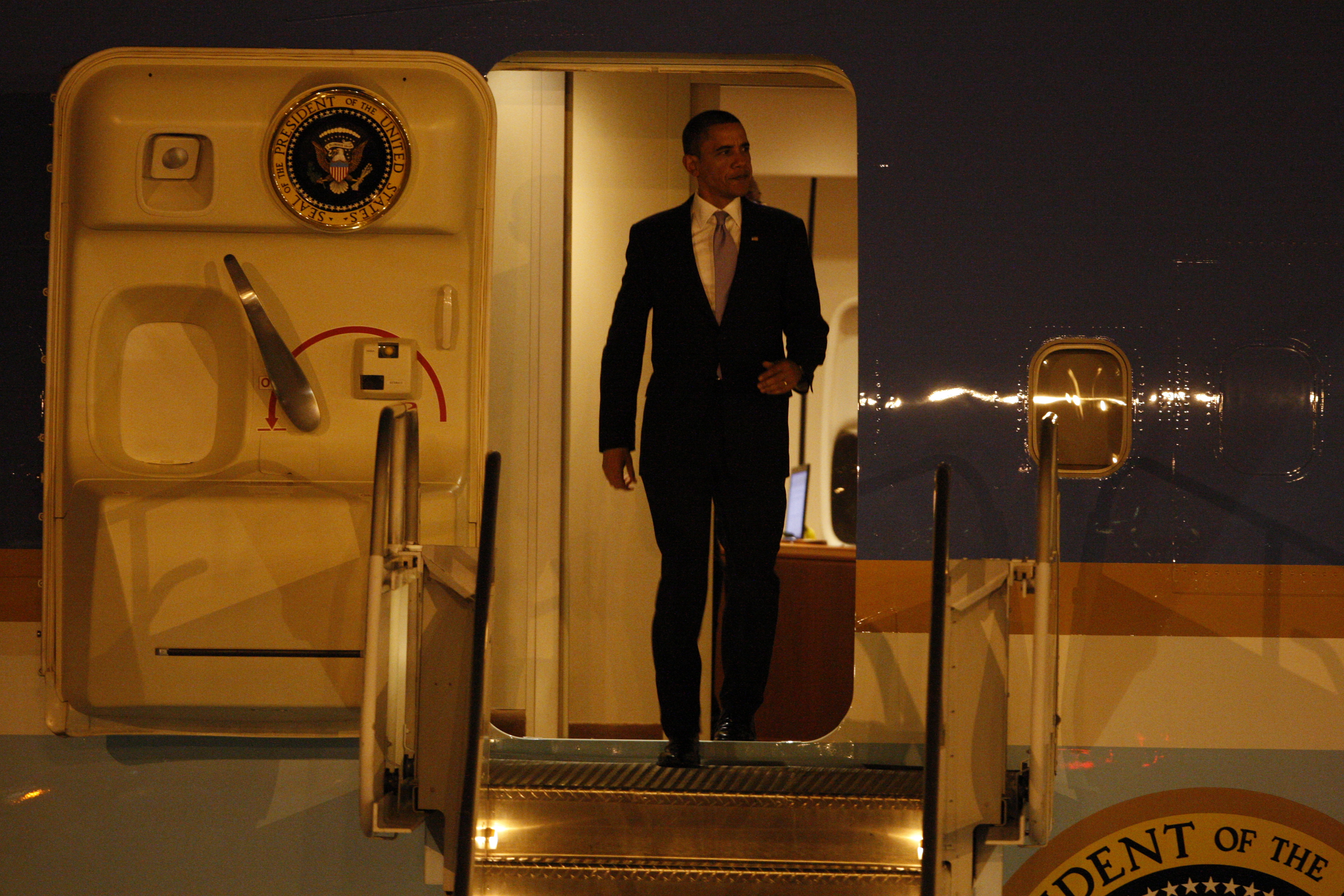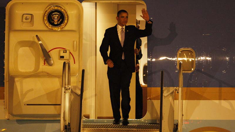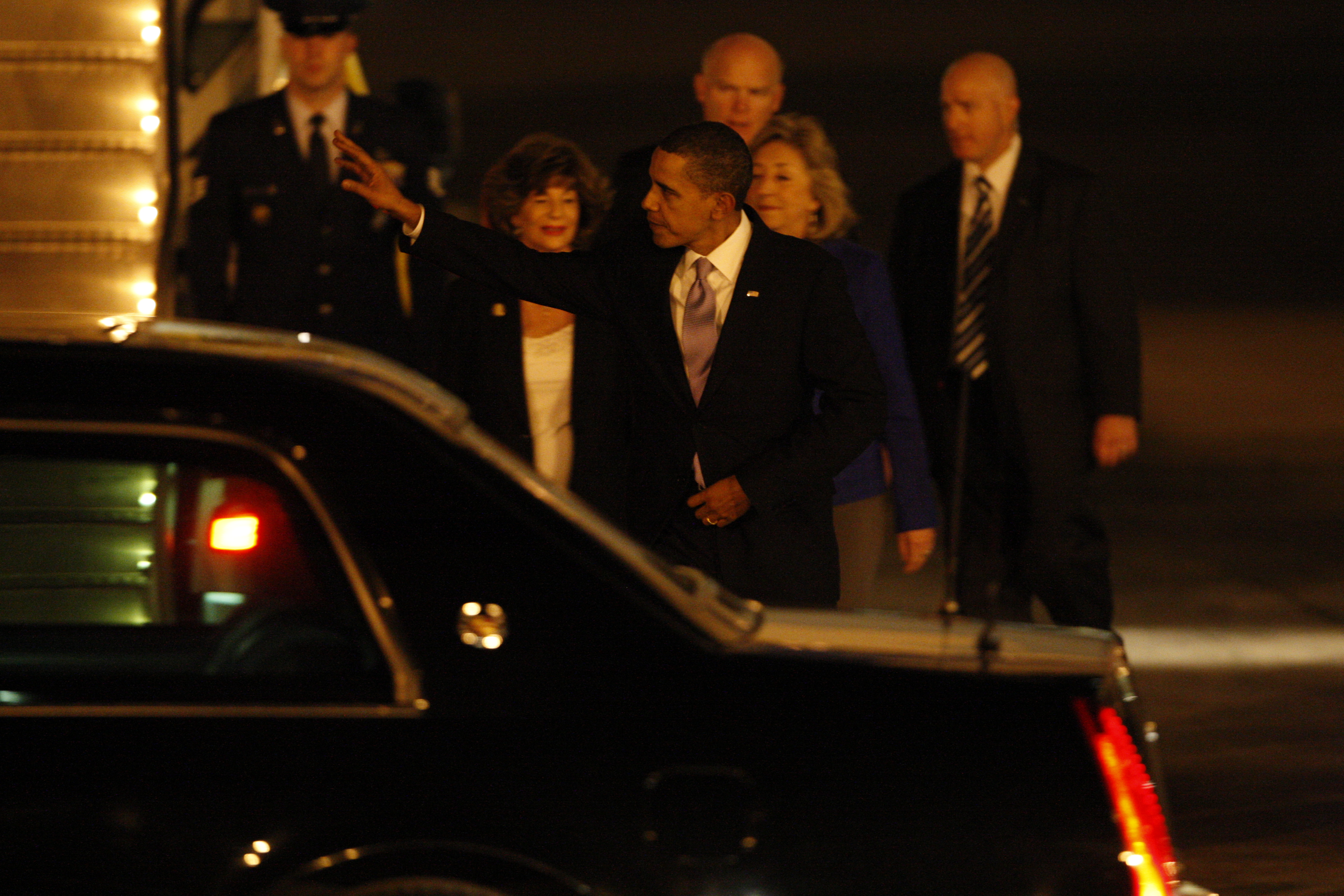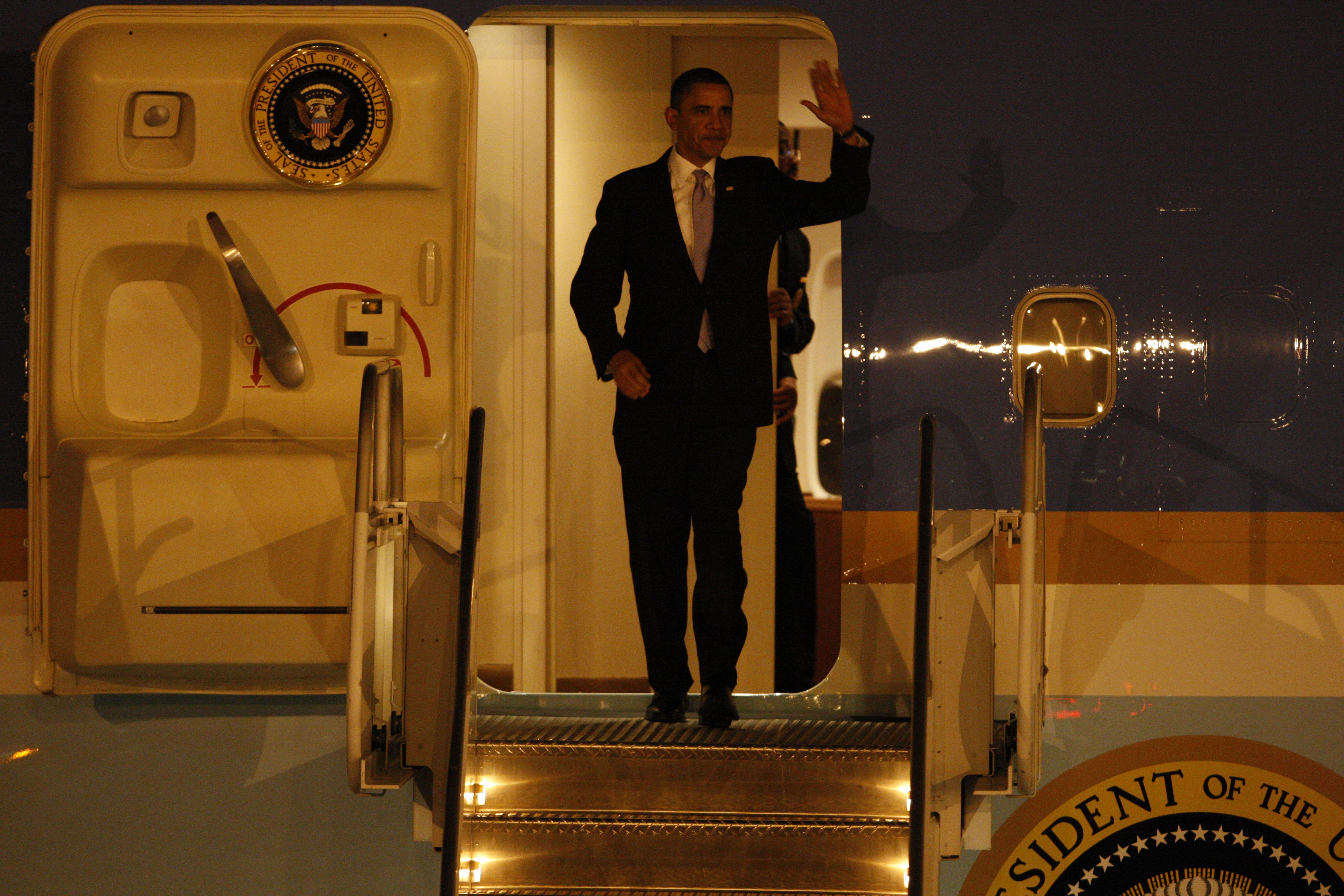 President Barack Obama waves from Air Force One as he arrives at McCarran International Airport Thursday, Feb. 18, 2010, for a series of events and discussions in the Las Vegas Valley. Events will include a town hall meeting on jobs and the economy at Green Valley High School at 10 a.m. Friday.